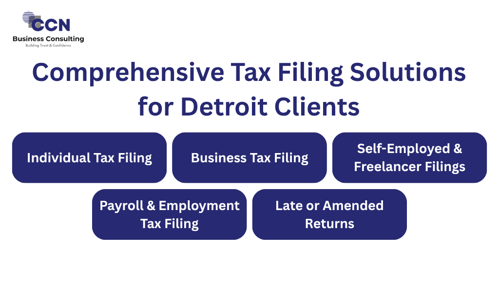 Tax season doesn’t have to be stressful. Whether you’re a business owner, freelancer, or individual taxpayer in Detroit, accurate and timely tax filing is essential for financial peace of mind. At CCN Business Consulting, we specialize in providing Detroit MI tax filing services designed to make the process simple, compliant, and cost-effective.